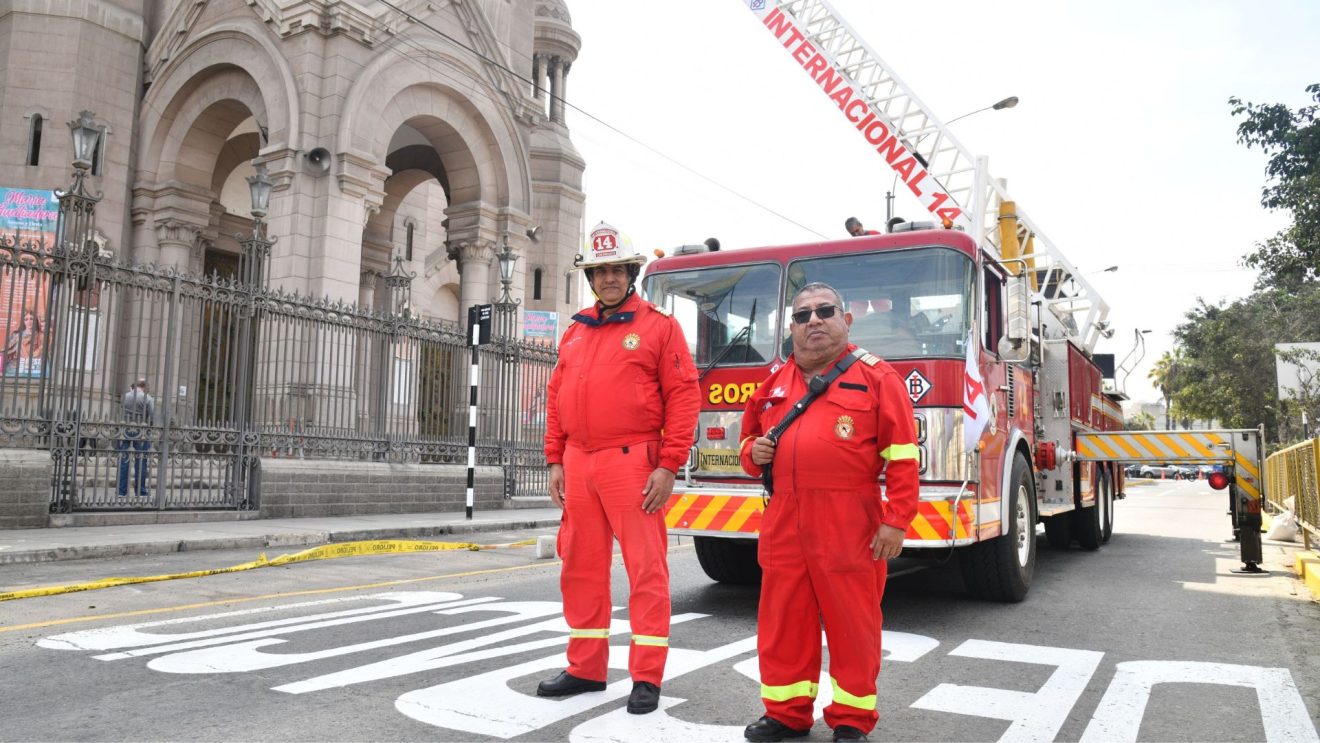 Compañía de Bomberos Internacional N°14 limpia el frontis de la fachada de la Basílica de María Auxiliadora