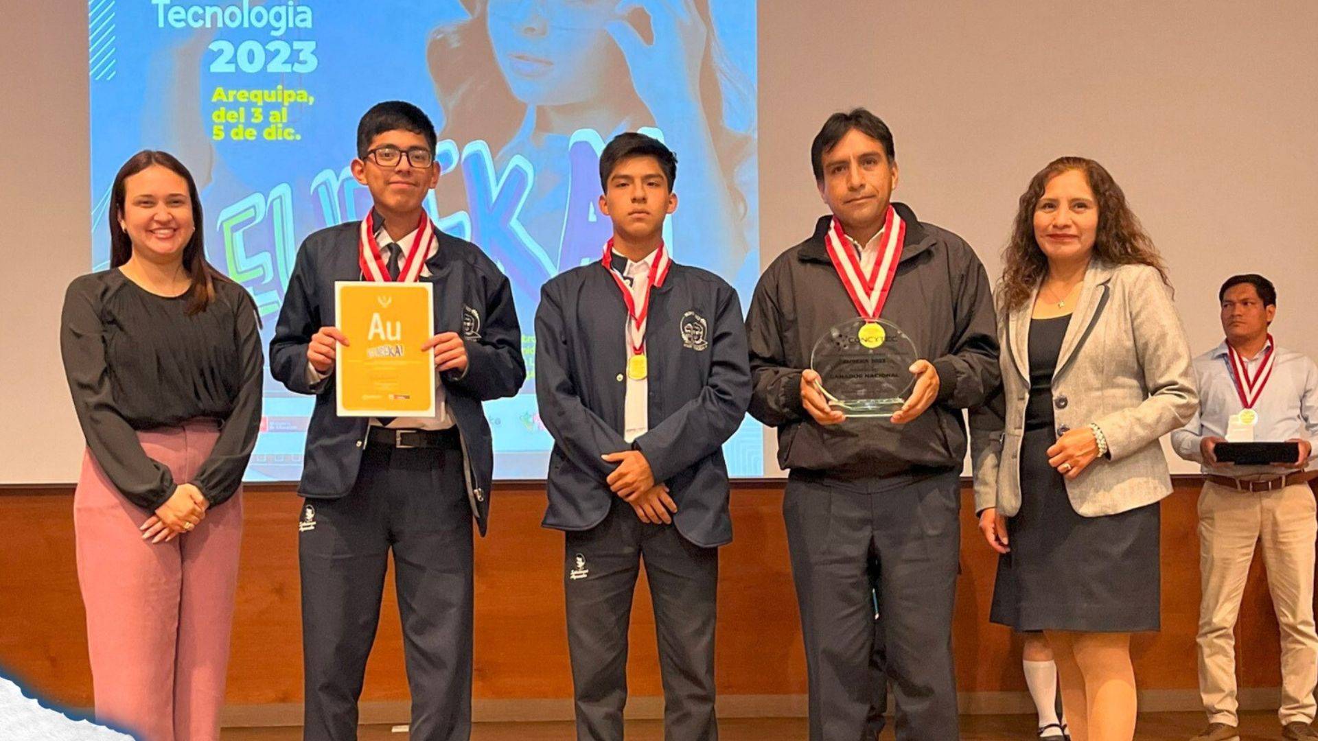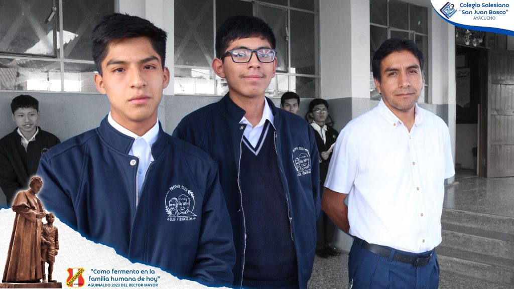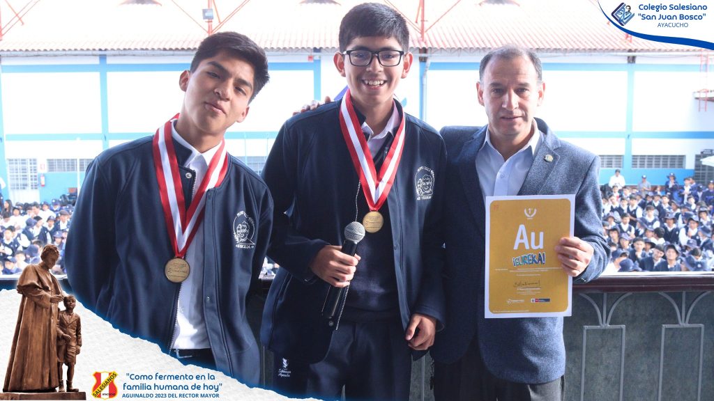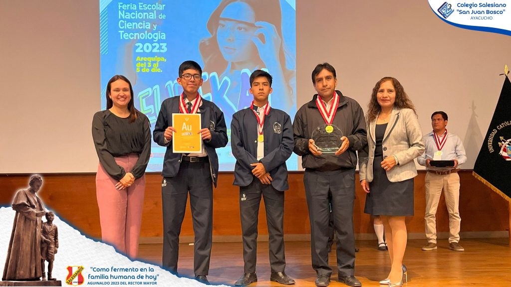 En el auditorio de la Universidad Católica Santa María de Arequipa, los estudiantes del Colegio Salesiano San Juan Bosco de Ayacucho, Eduardo Raúl Vila Castellares y Diego Aurelio Delgado de la Cruz Maldonado, junto a su asesor, el profesor Johny Paúl Barboza Palomino, recibieron un destacado reconocimiento al obtener el 1°er lugar en la Feria Escolar Nacional de Ciencia y Tecnología Eureka, en la categoría B – Alternativas de Solución Tecnológicas.