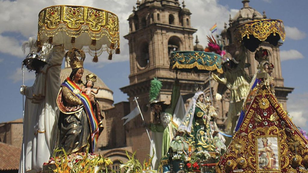 Los preparativos comienzan días antes. Las calles se llenan de aromas intensos: cera, flores frescas, incienso y comidas típicas. En los templos cercanos, las quince parroquias tradicionales de Cusco preparan las andas de sus santos y vírgenes.