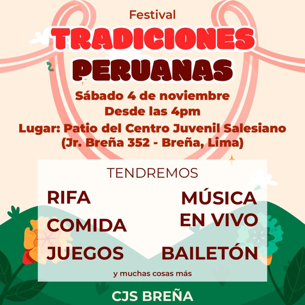 Los jóvenes del Oratorio Centro Juvenil de la Parroquia María Auxiliadora de Breña se han unido para organizar el Festival de Tradiciones Peruanas, que se llevará a cabo el 4 de noviembre a partir de las 4:00 de la tarde. El propósito de este evento es recaudar fondos para la celebración de la Navidad del Niño.
