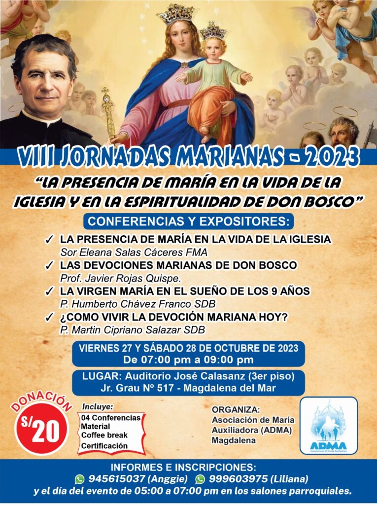 Bajo el lema «La Presencia de María en la vida de la Iglesia y en la Espiritualidad de Don Bosco», el viernes 27 y sábado 28 de octubre se celebrarán las VIII Jornadas Marianas – 2023, un evento promovido por la Asociación María Auxiliadora (ADMA) de la Comunidad Salesiana de Magdalena del Mar.